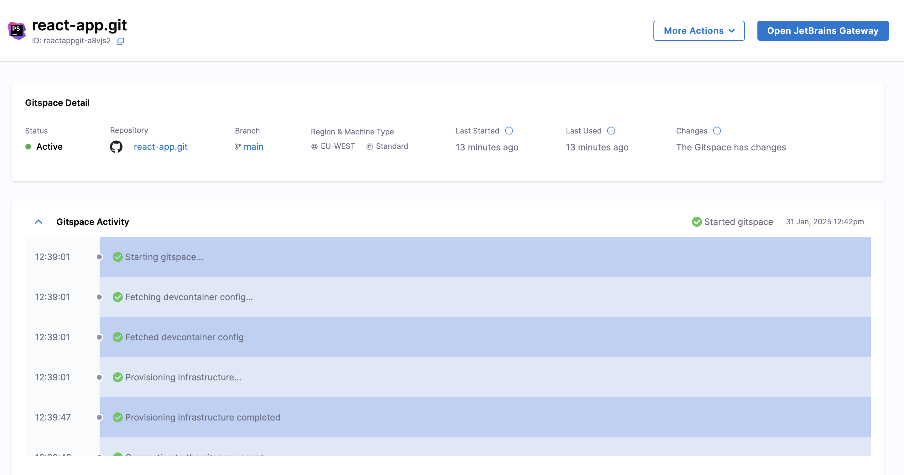 - Once the Gitspace is created and running, click on the "Open JetBrains Gateway" button.