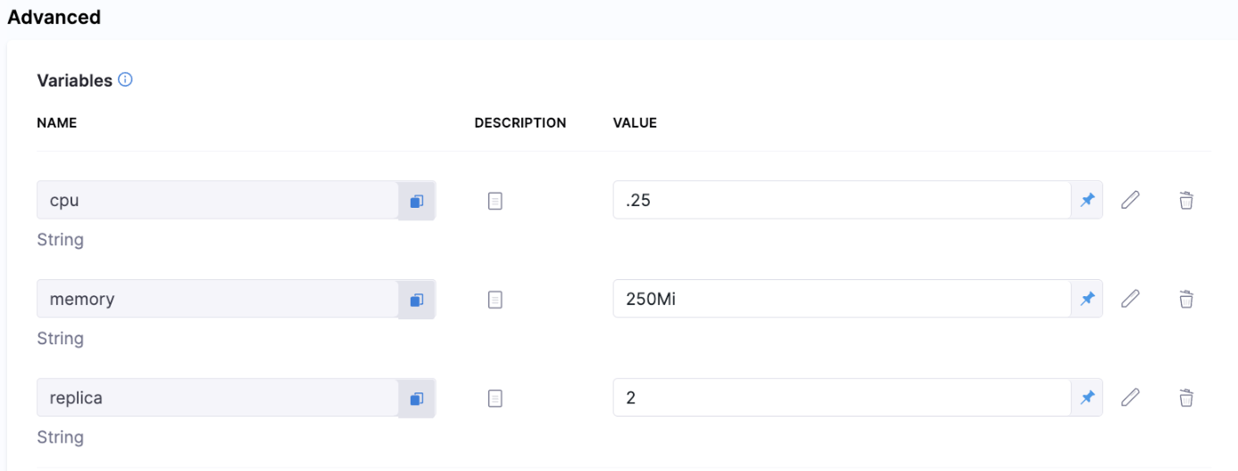 You can configure variables in a service and reference them in the service's values.yaml file or in pipeline execution steps.