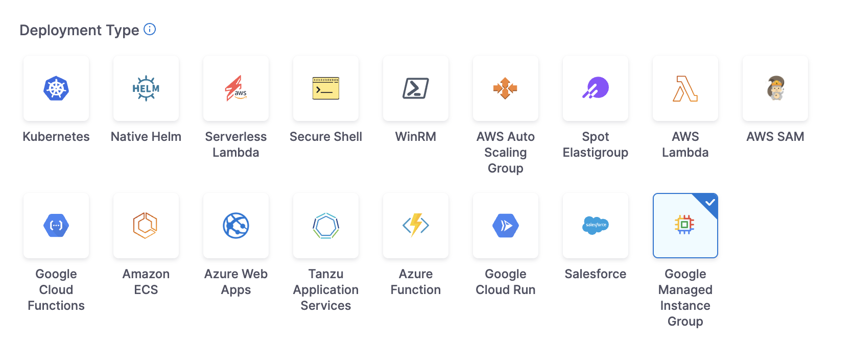 Setting up a MIG deployment starts with creating a new Continuous Delivery pipeline in Harness. Navigate to your project and create a new CD pipeline, then add a Deploy stage. When Harness prompts you to select the deployment type, choose Google Managed Instance Group from the available options. This selection ensures that Harness configures the stage with MIG-specific capabilities and deployment steps.