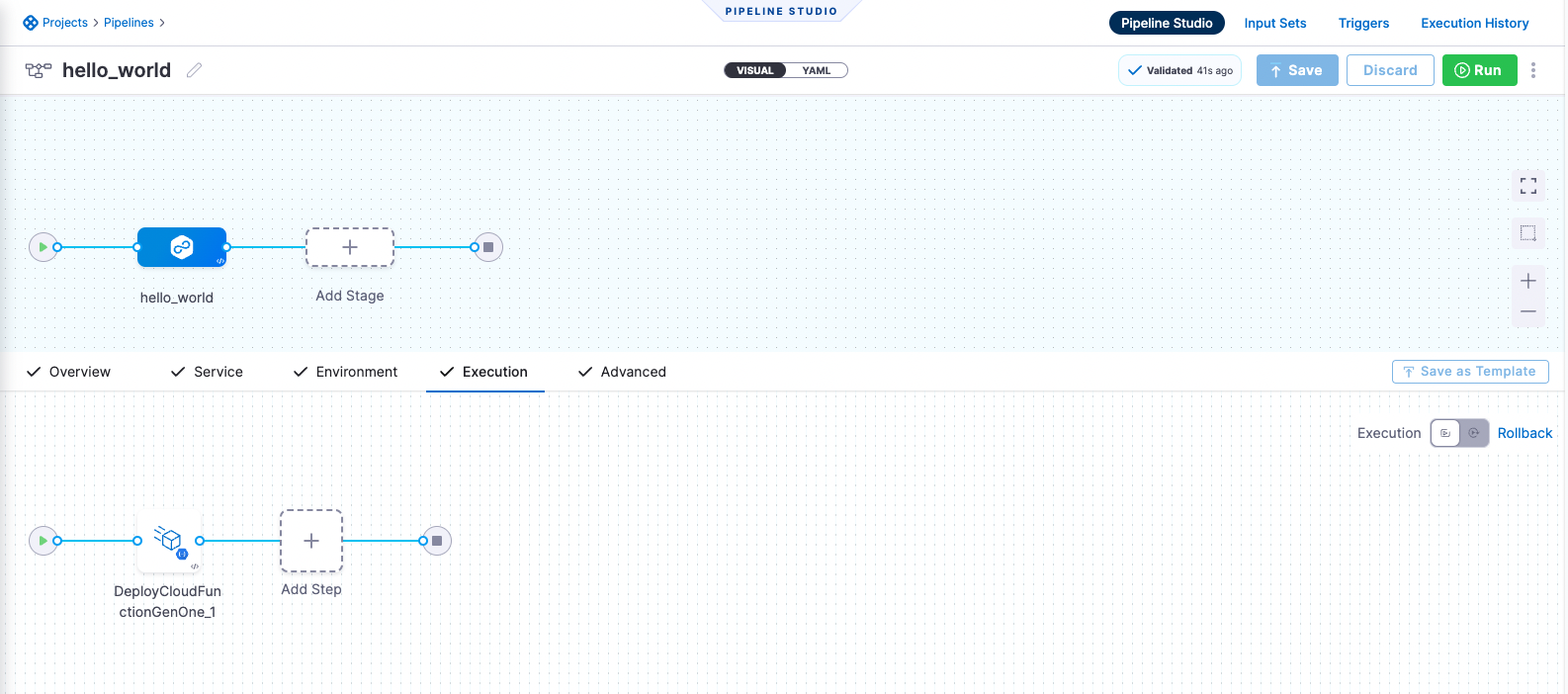 harness pipeline --file "/google_cloud_function/2nd_gen/canary-pipeline.yml" apply - In Harness, you can switch to the Visual editor and confirm the pipeline stage and execution steps as shown below.