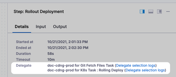 Harness displays which Delegates performed each task in the Details of each step.