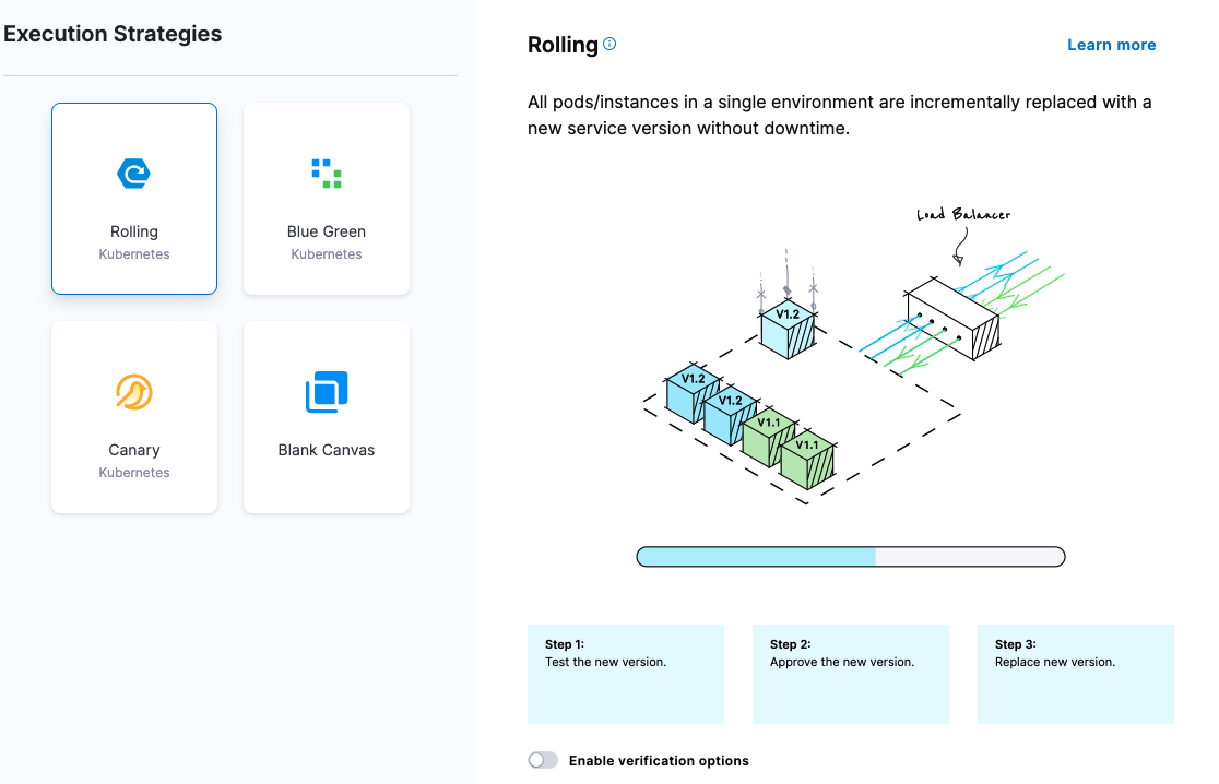 You have likely heard terms like blue/green and canary when it comes to deploying code and applications into production. These are common deployment strategies, available in Harness CD as stage strategies, along with others.