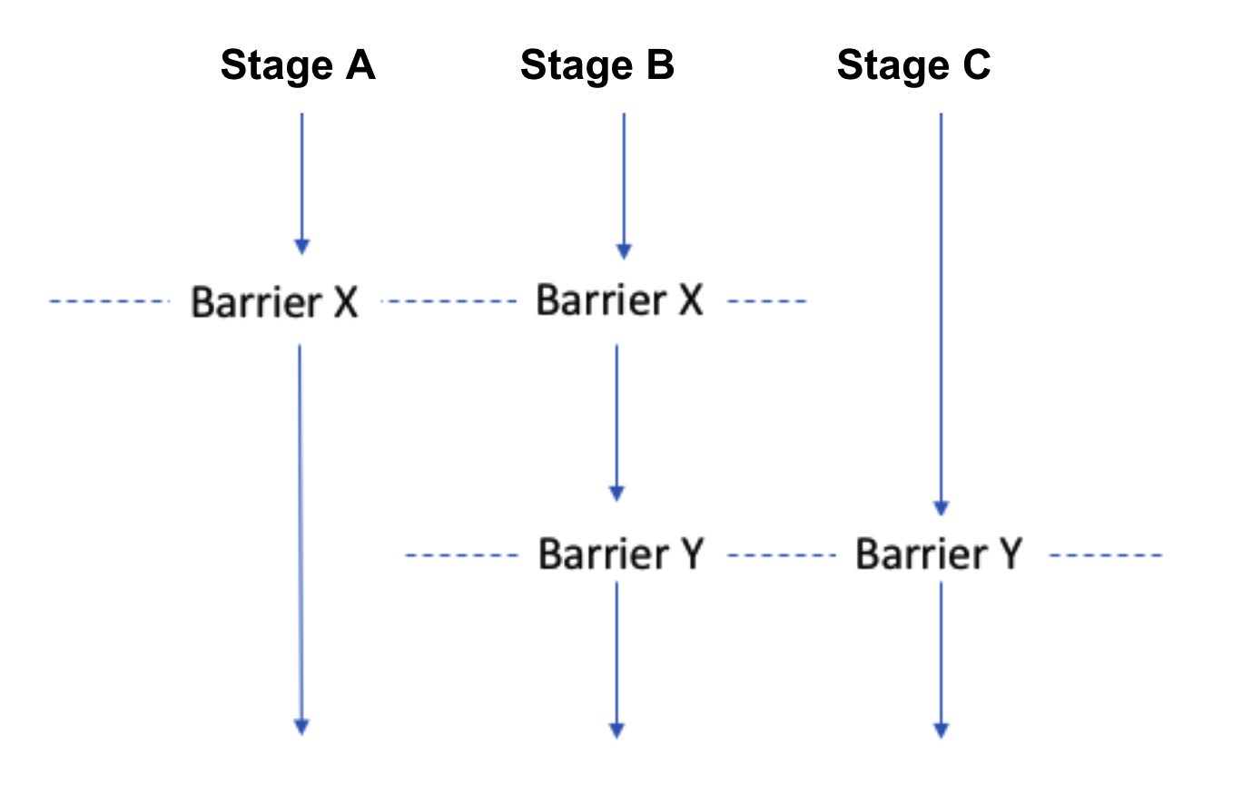 Here's a visualization of three stages run in parallel using Barriers. Stages A and B will wait for each other to reach Barrier X and Stages B and C will wait for each other to reach Barrier Y.