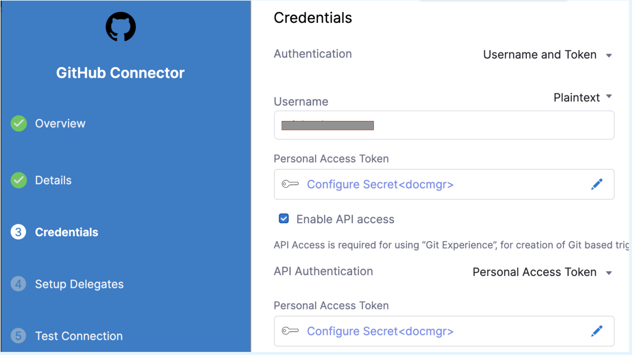 importantConnector must use the Enable API access option and token. The connector must use the Enable API access option and Username and Token authentication. Harness requires the token for API access. Generate the token in your account on the Git provider and add it to Harness as a Secret. Next, use the token in the credentials for the Git Connector.