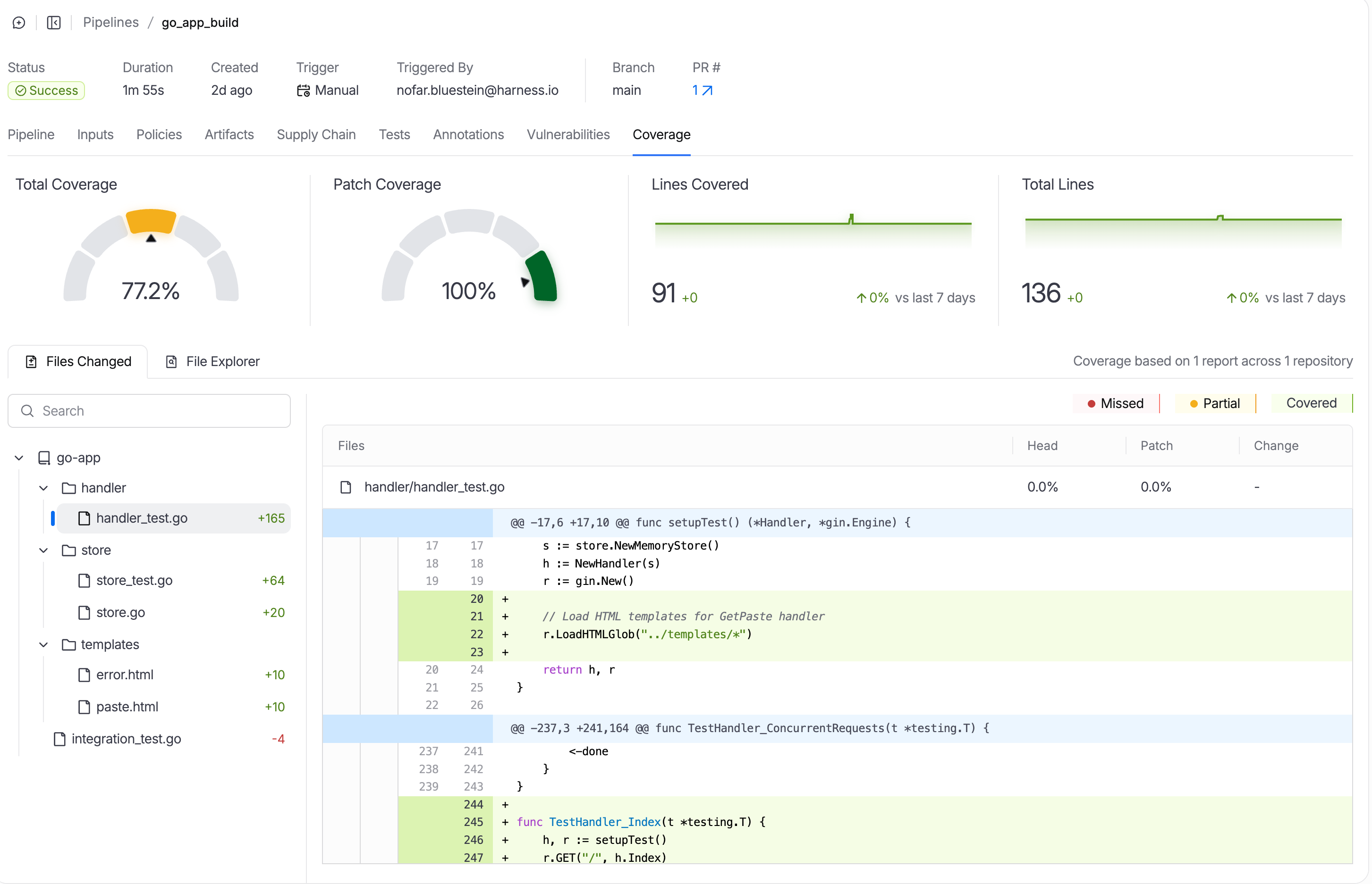 Code coverage shows what percentage of your code is exercised by tests. Harness displays coverage metrics in the Coverage tab of your pipeline execution, helping you identify untested code paths.