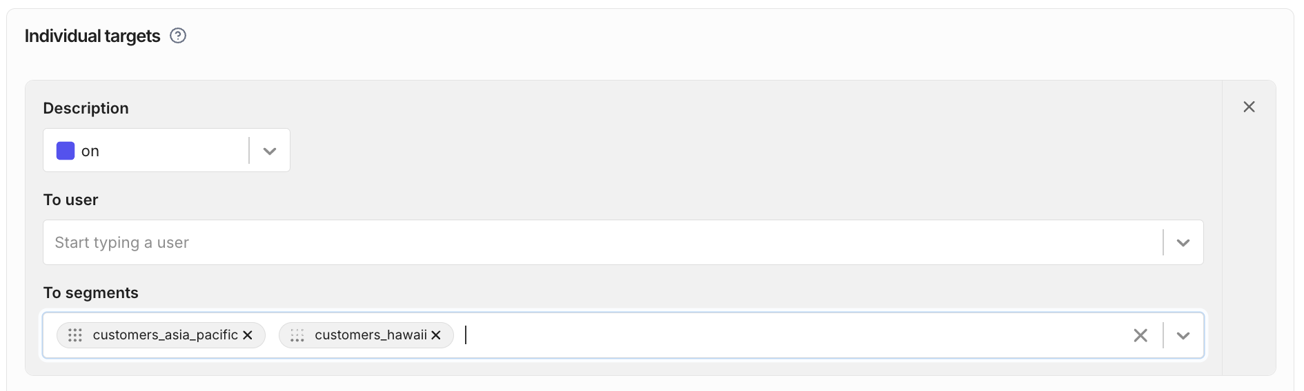 You can target segments in individual targeting rules. These rules assign a treatment to the segment. In the following example, the feature flag will serve on to all user IDs in the given segments.