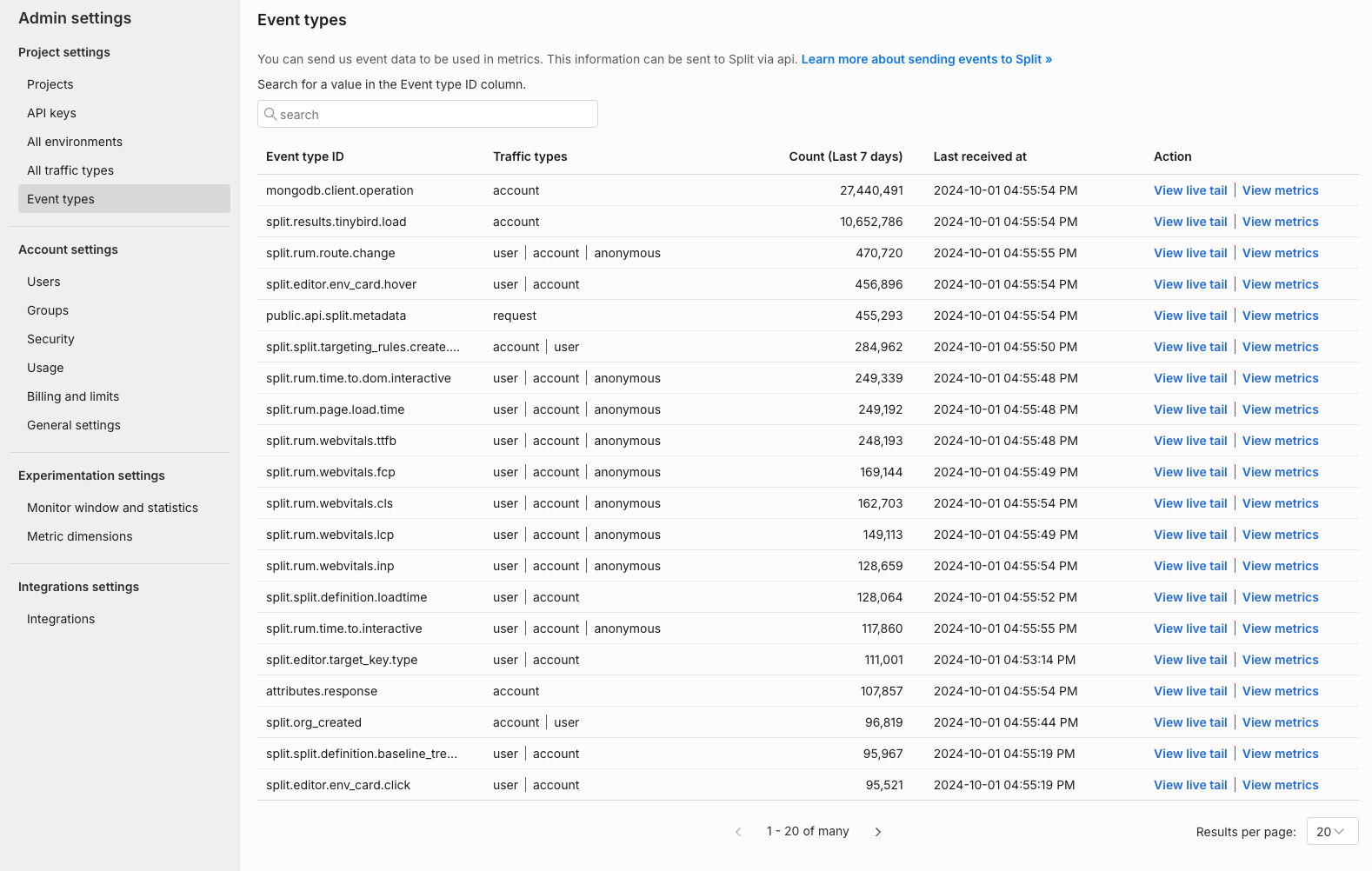To help verify that events are being received by Split, from the left navigation pane, click the user's initials at the bottom, select Admin settings, and click Event types.