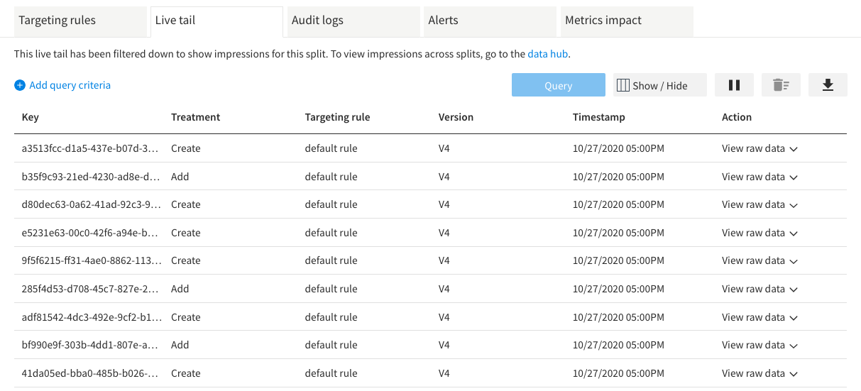 1. First, make sure that you are getting impressions for the feature flag in the given environment by navigating to the Live tail tab of the feature flag and initiating a query. Keep in mind that this tab will only show impressions if the feature flag is actively receiving traffic.