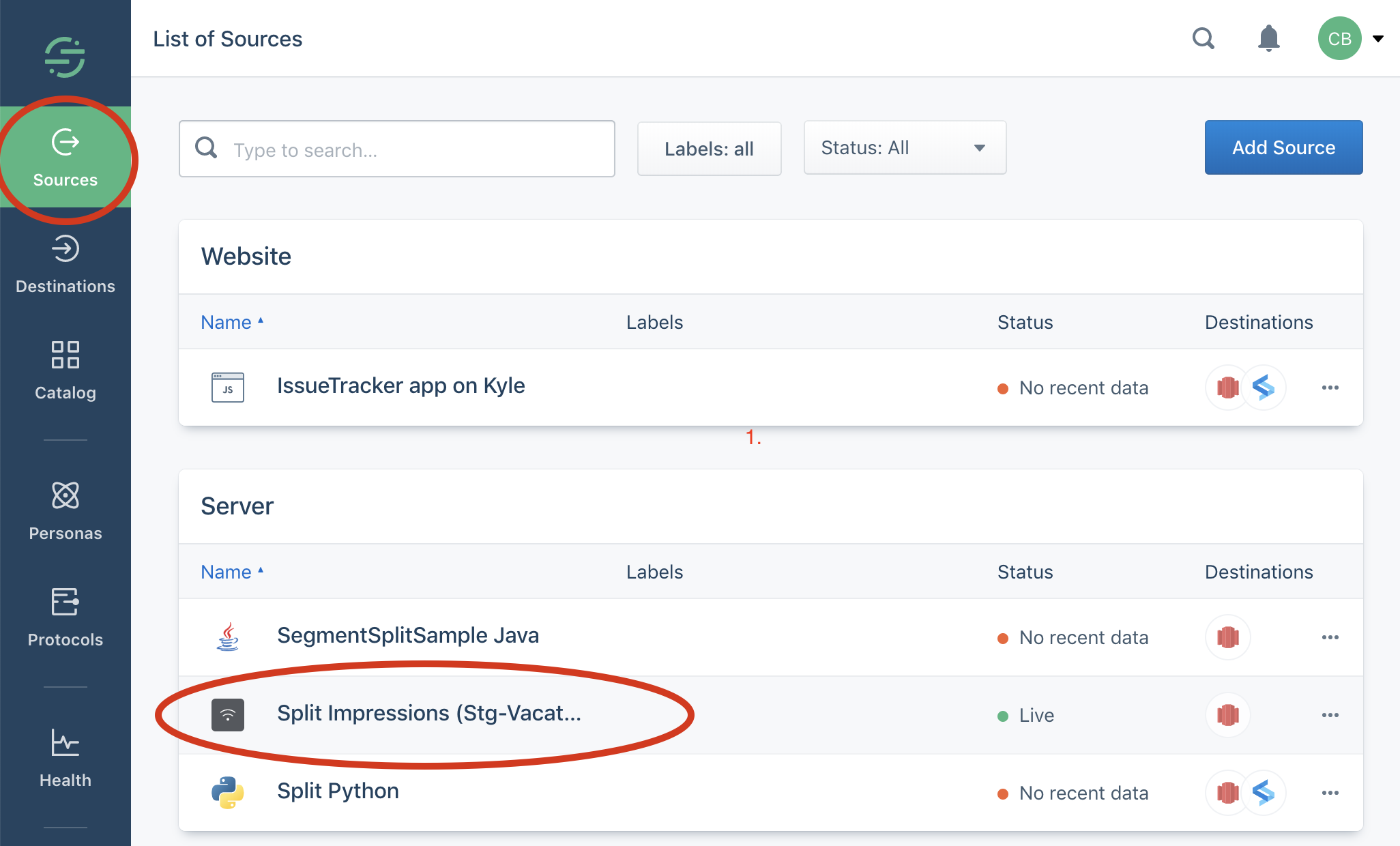 2. In your Segment workspace, navigate to the list of sources and select the source you wish to check. It will be an HTTP Source. Hopefully, whoever set it up will have employed the best practice of including the name of the Split environment in the name of the source, so you know which source corresponds to the environment you are verifying.