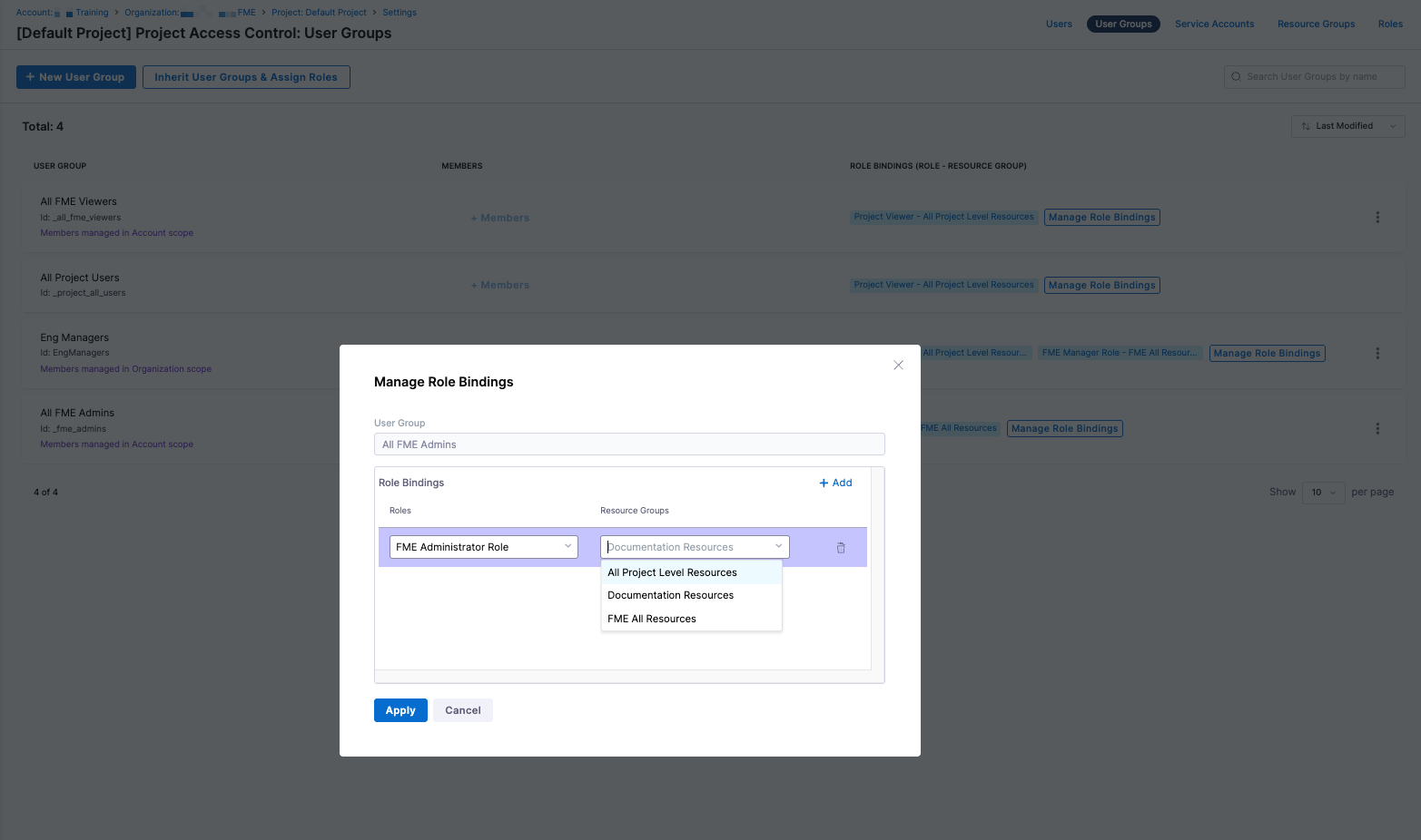 Resource Groups define which FME resources and environments users can access within a project. Each resource type supports two access controls: