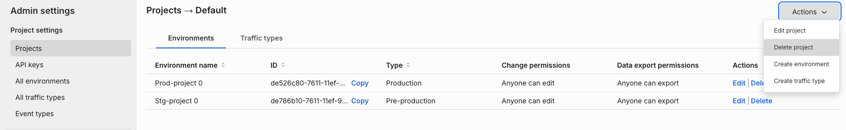 You will see a list of environments for the selected project, now you can delete each environment using the Delete link.