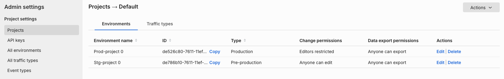 - Manage the environments and traffic types in a project by clicking View in the Actions column for selected projects.