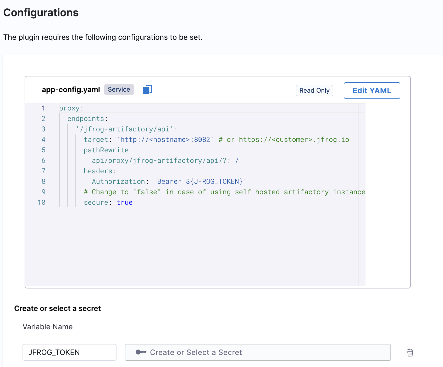 • Under the Plugins tab in Admin, go to app-config.yaml and Edit YAML to configure your JFrog endpoint in the target field in the format as shown below.