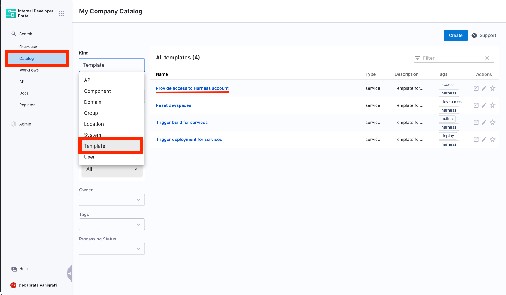 - Navigate to the Catalog page, and select Template under Kind.