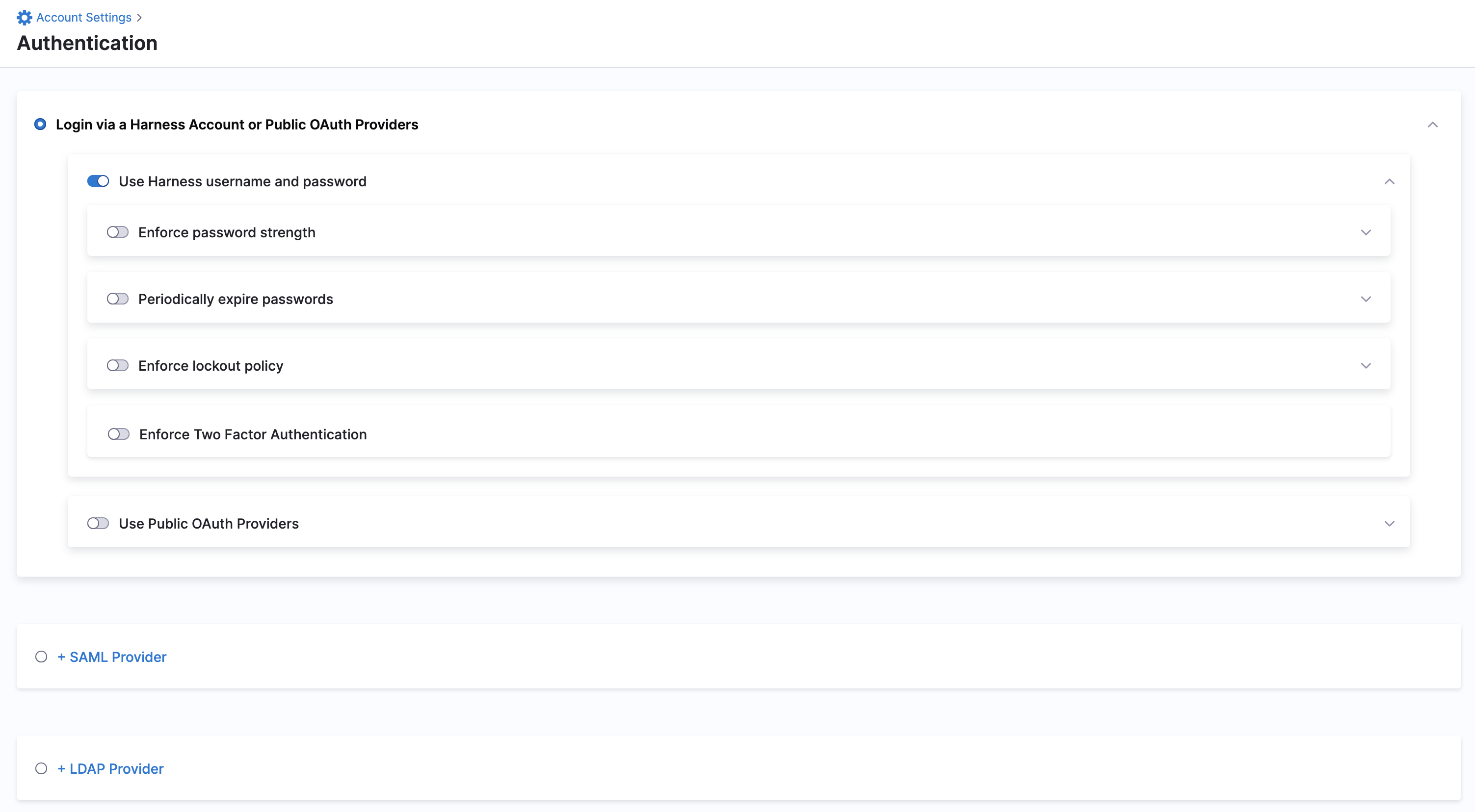 - In your Harness account, click Account Settings, and then click Authentication.