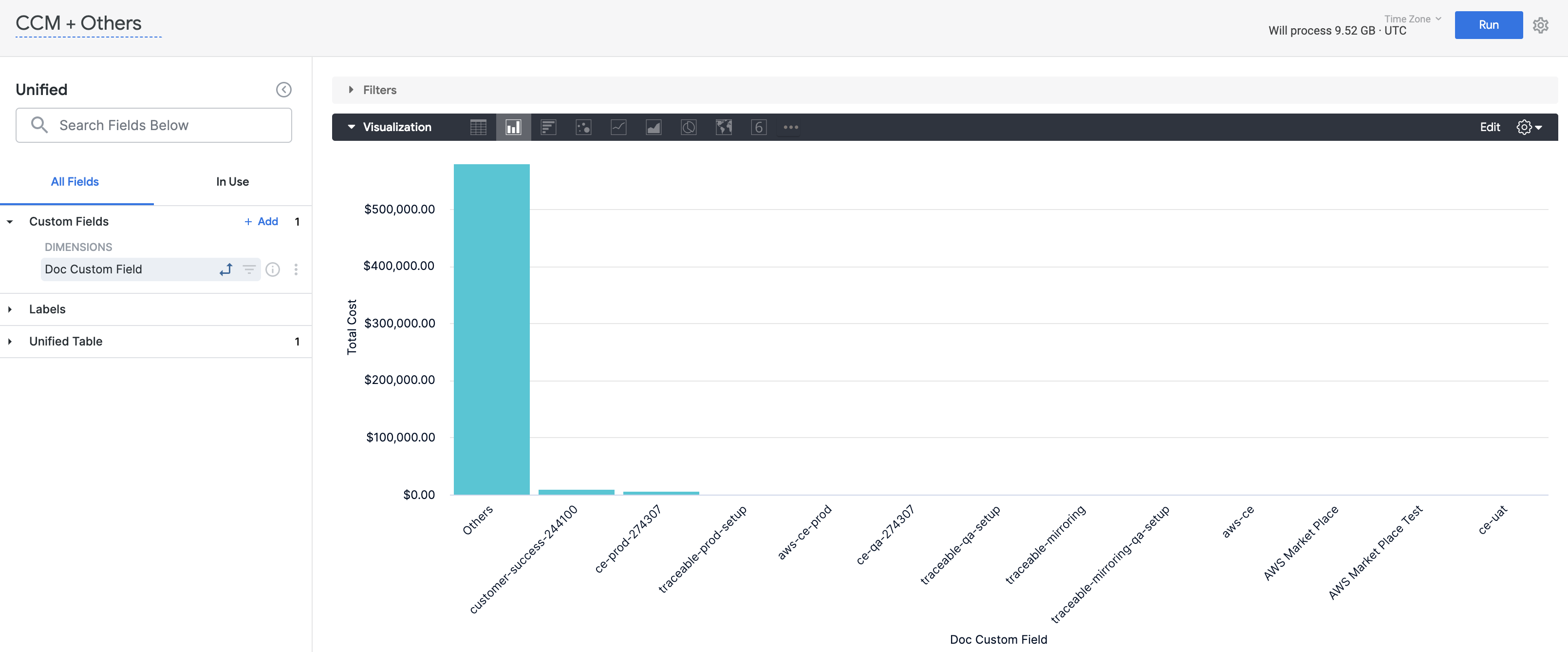 This custom field is a regex search on all cloud cost management accounts for the string ce. Any account, project, or subscription without this string is bucketed under Others. You can use custom fields to get more specific and granular data for your analysis.