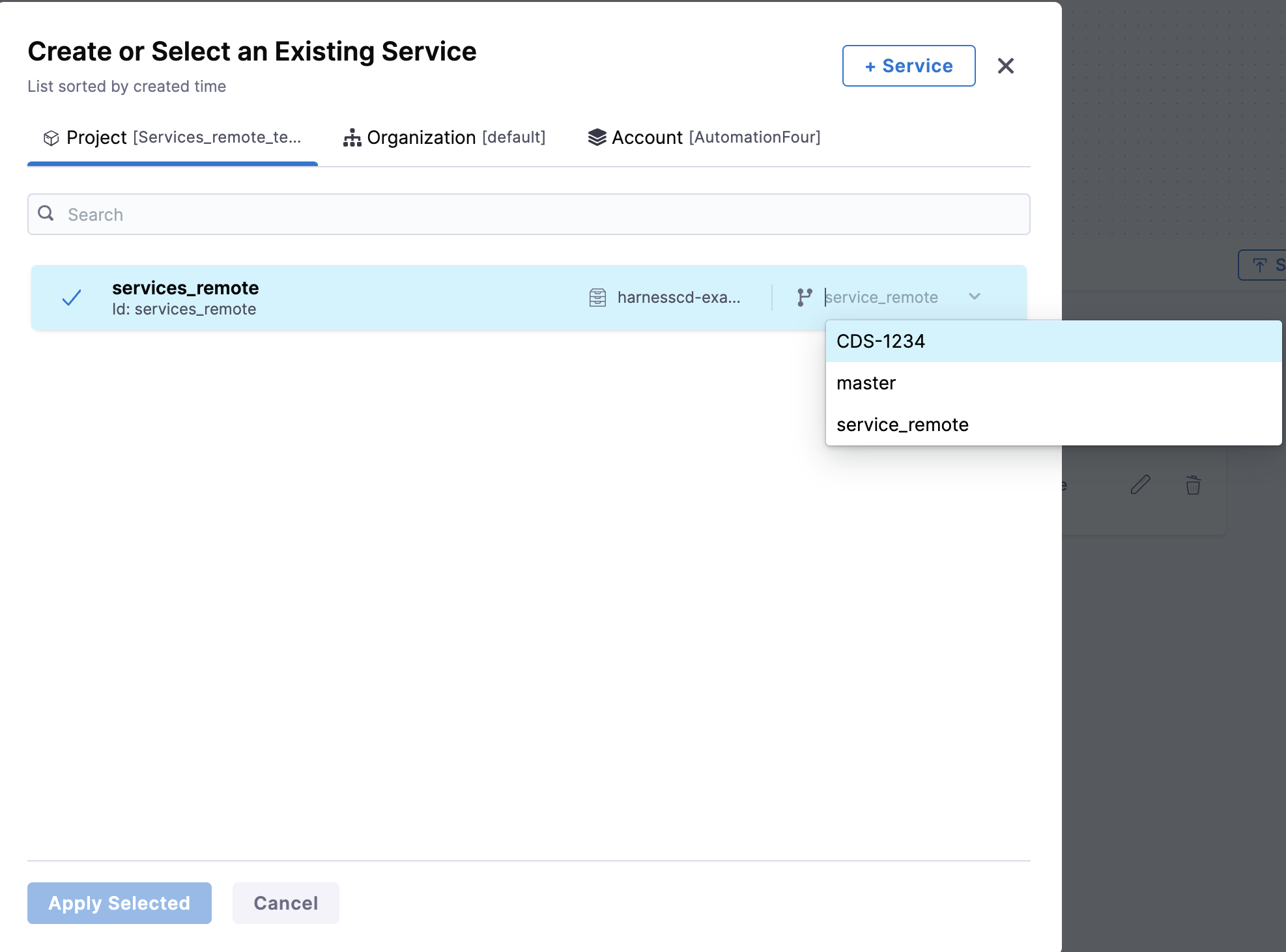Select the branch for the version of the service you want to use in your pipeline.