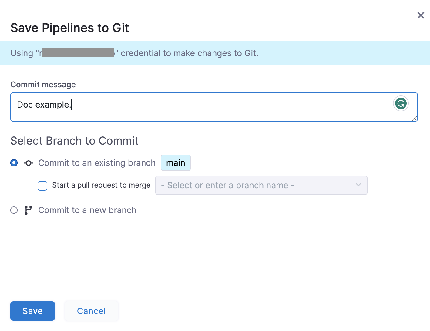 Select Save to use the credentials from the Git connector for the commit.