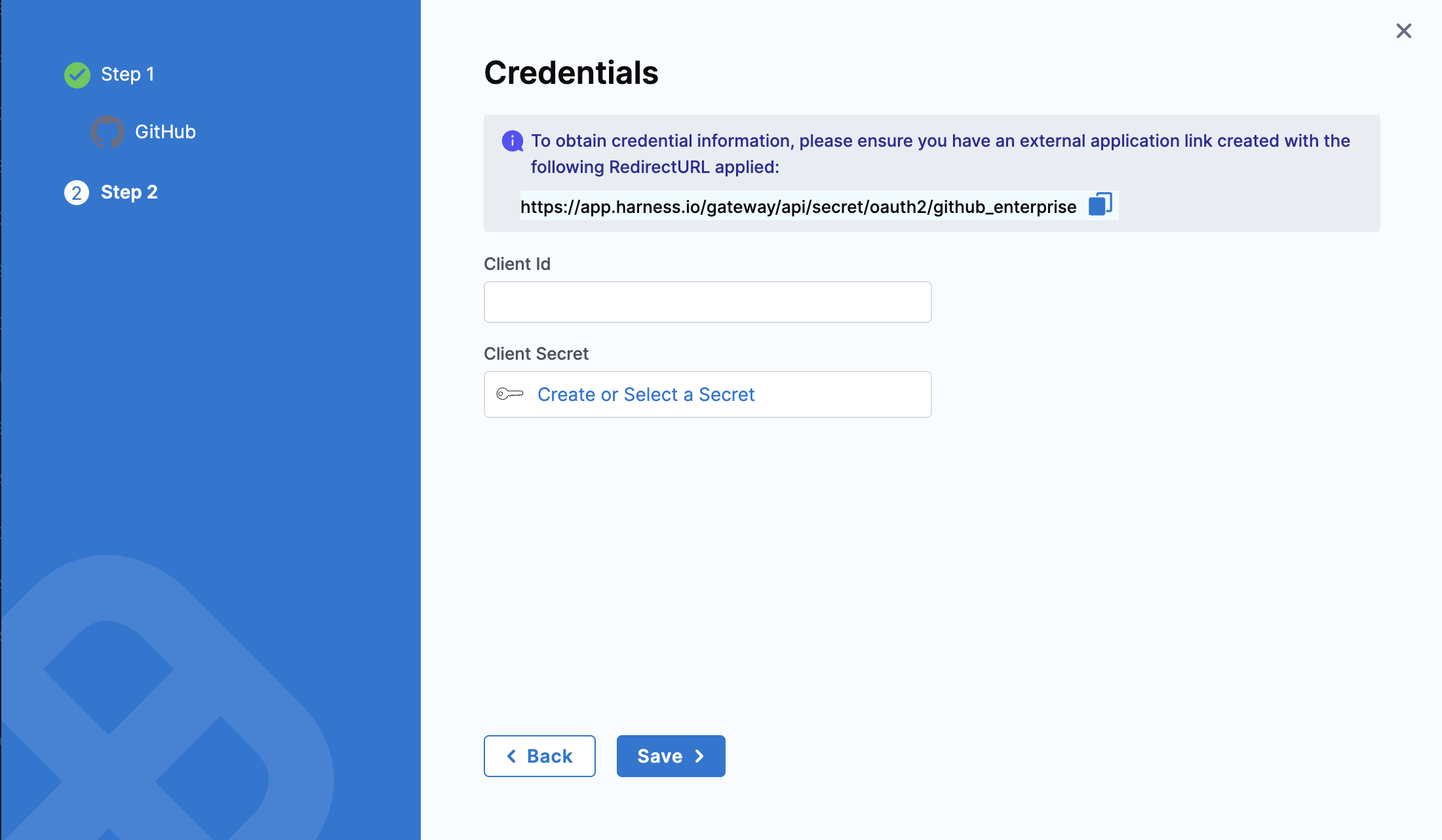 - Once you save the application, copy the Application ID and Secret and use these to configure the provider on the Harness Credentials page.