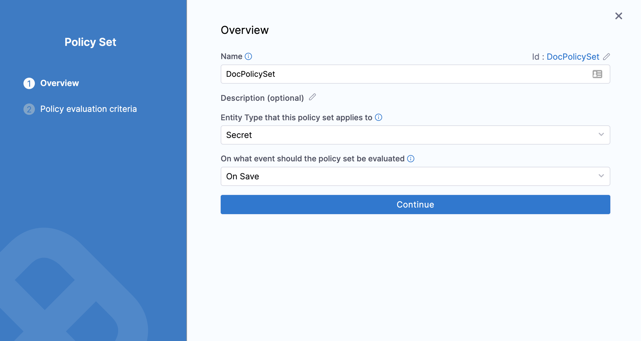 Existing Secrets are not automatically updated with policies. Policies can be applied to Secrets only on a save when they are created or updated.In Policy evaluation criteria, click Add Policy.