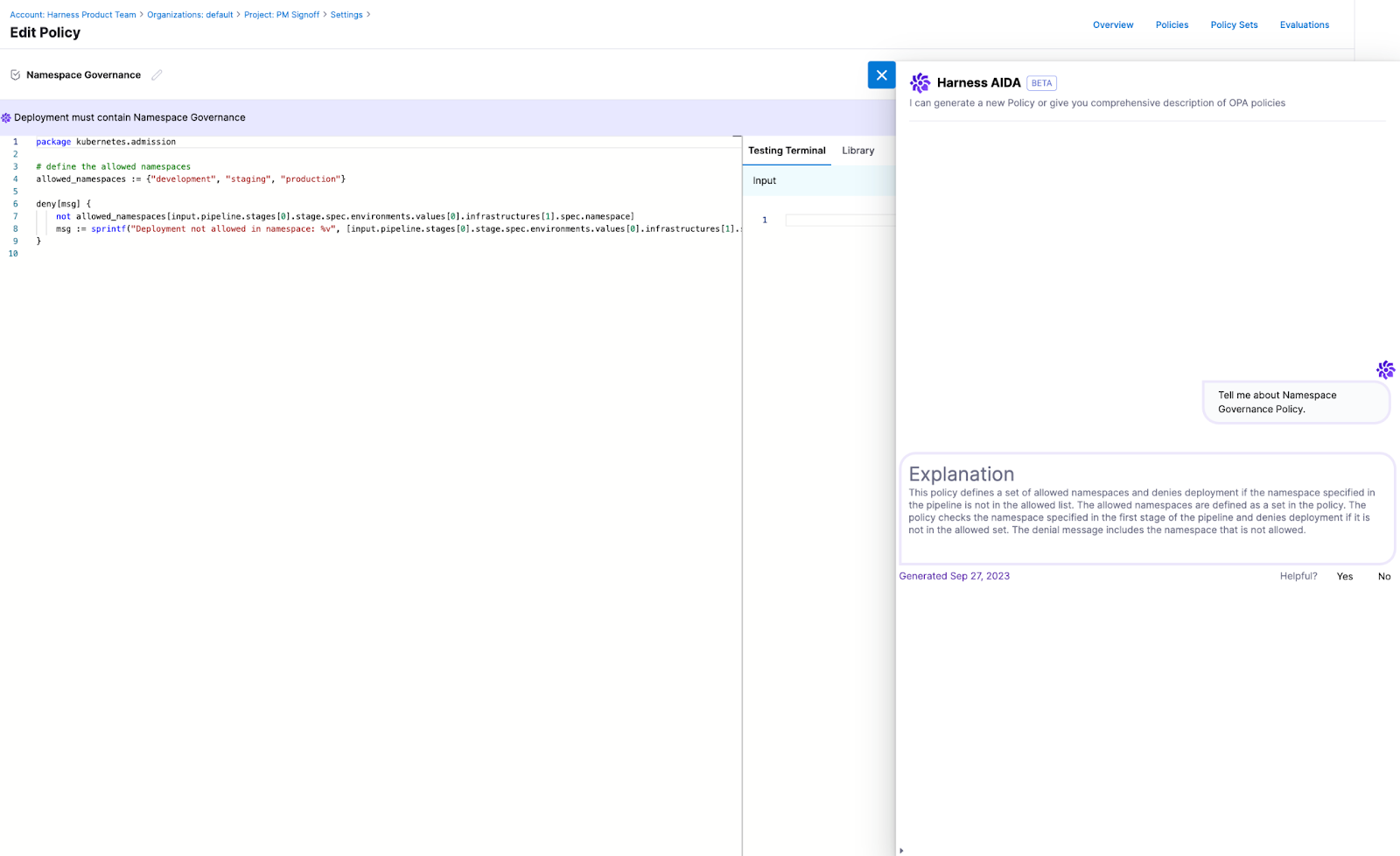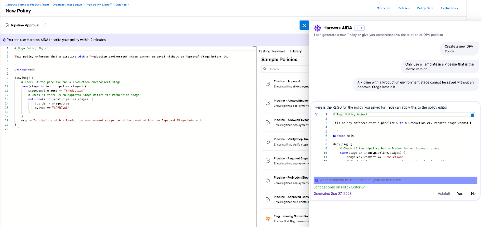 Create OPA Policies: Harness AI helps you get started and write OPA Policies based on pipelines, connectors, and templates, and other Harness objects with no need to understand the nuances of REGO (Open Policy Agent language).