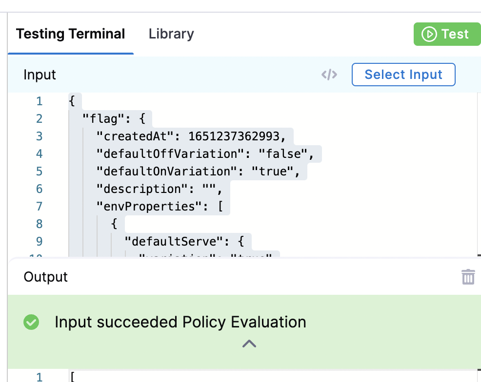 You can only test a policy in the Testing Terminal if you have previously run a Policy Evaluation. If you are creating your first ever policy for the Project, continue to Step 2: Add the Policy to a Policy Set. After you have applied your first policy to a Feature Flag, you can then use the Testing Terminal.