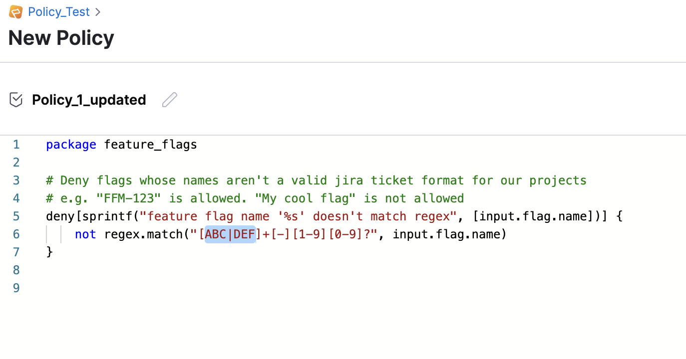 - Create a new Feature Flag. Make sure the flag adheres to the policy you are testing.