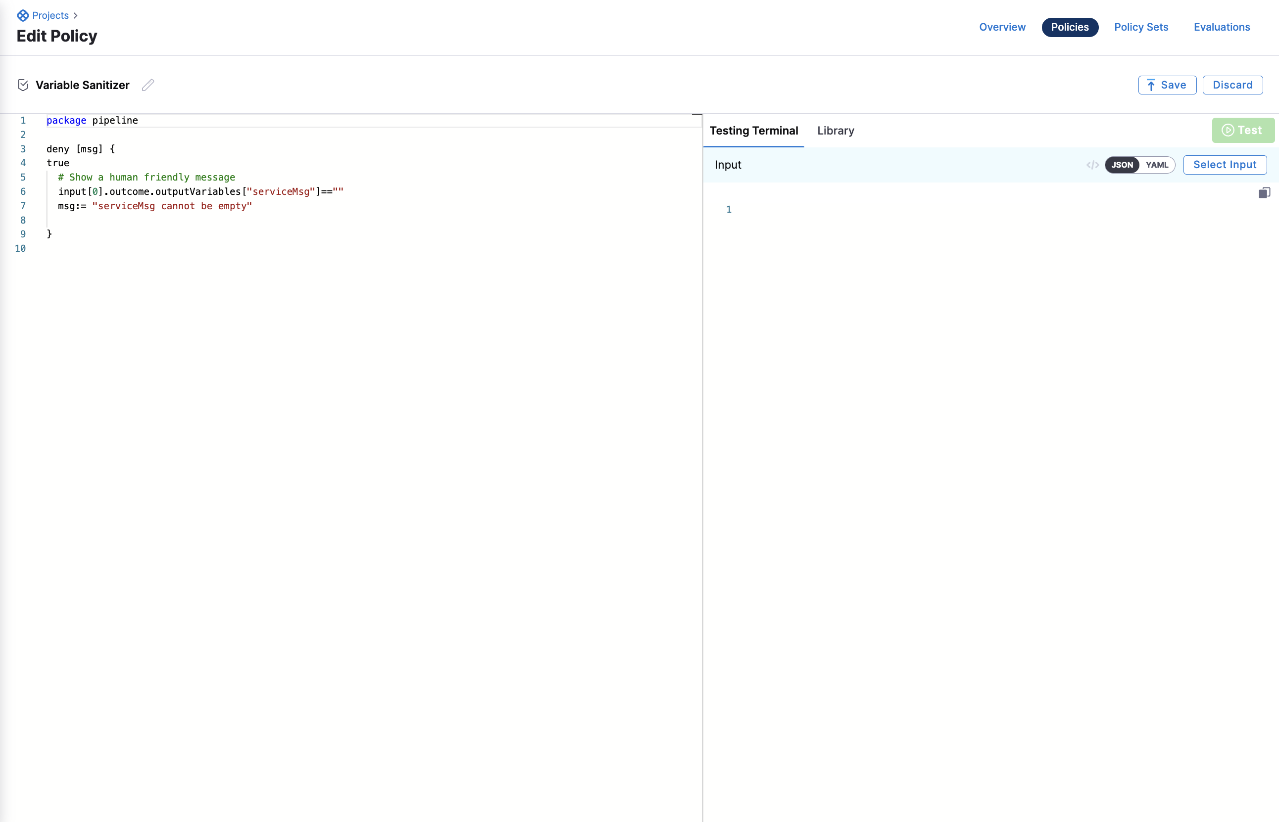 The policy above is checking to make sure that the message isn't empty. We want to enforce that all variables have some value that is not an empty value.