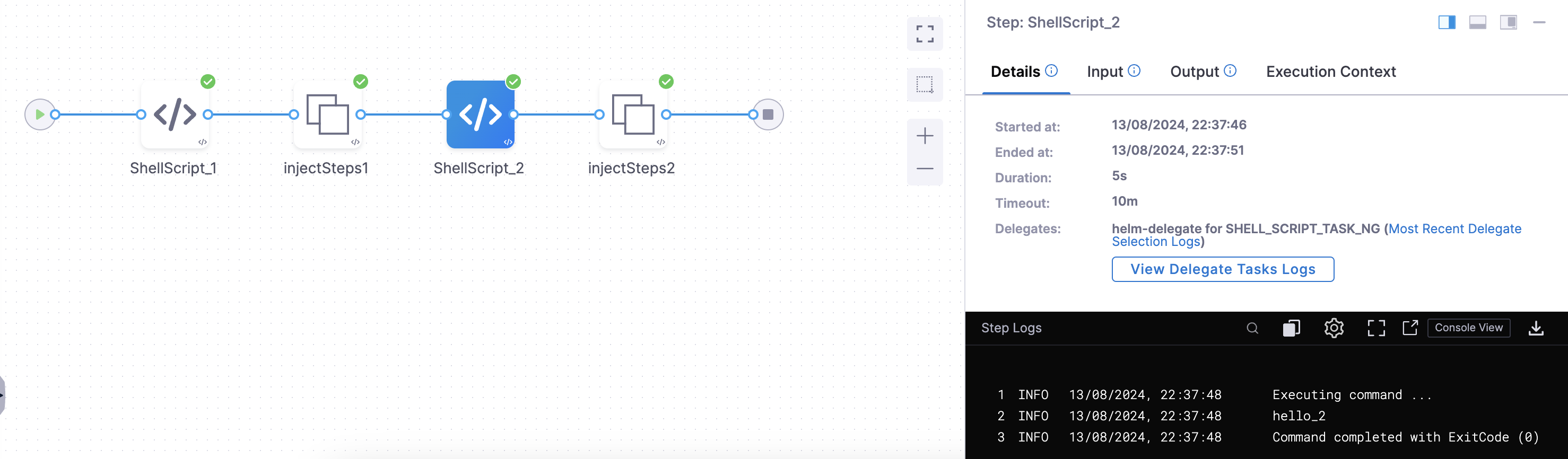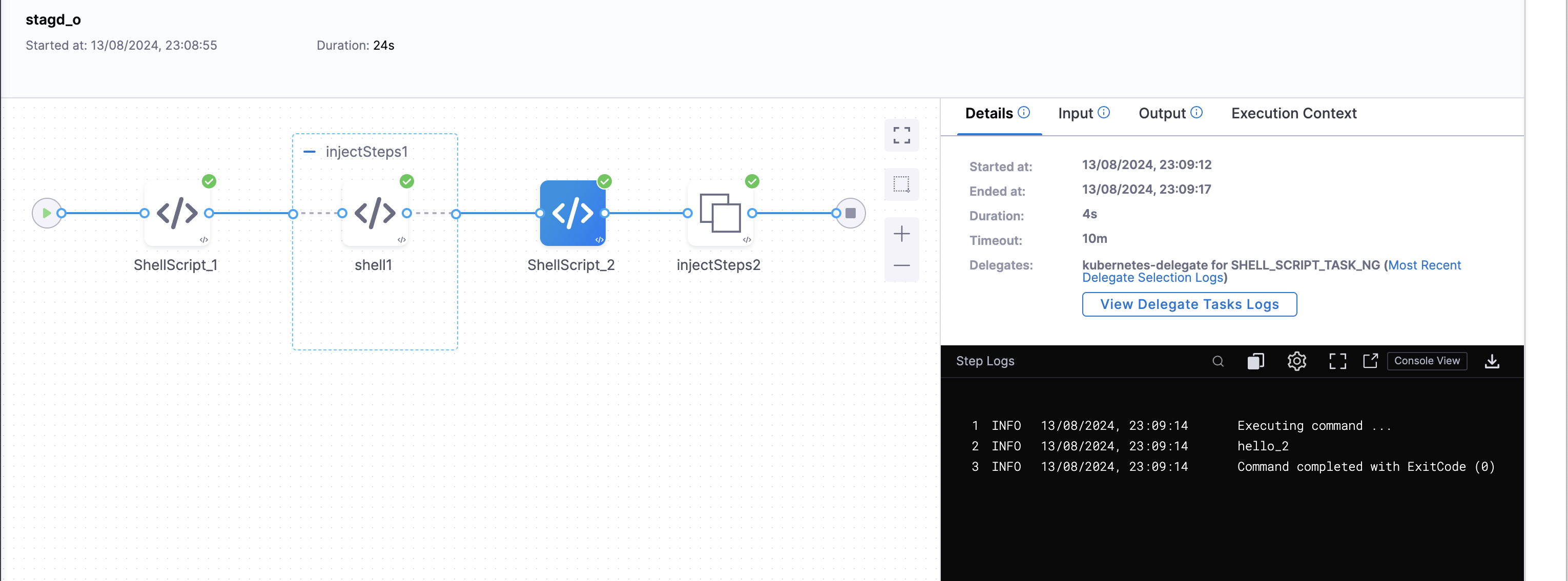 In this, under the first insert block we have added one Shell Script step. Now, when we run the pipeline the execution will look like :-