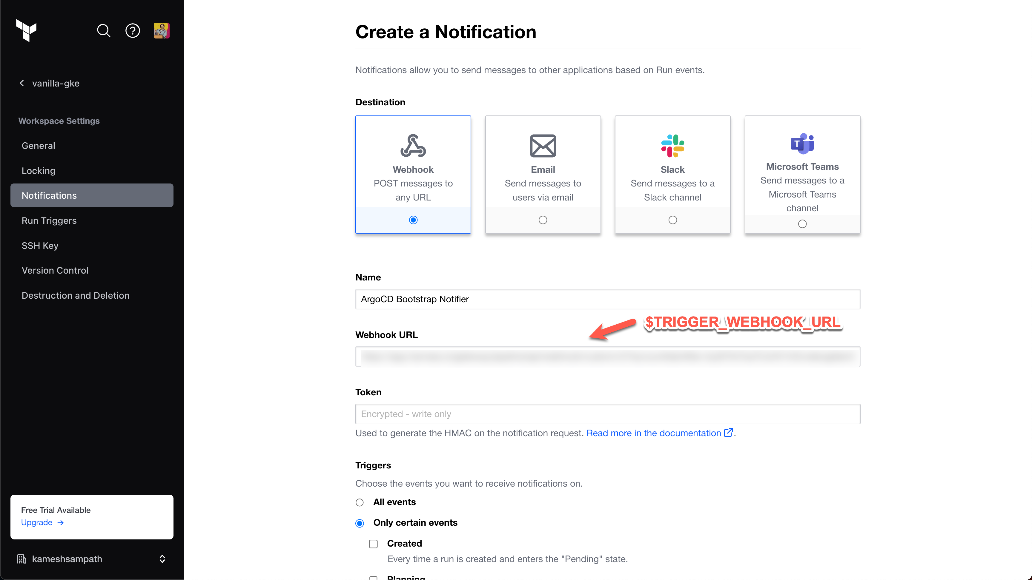 Argo CD Bootstrap Notifier. - Webhook URL: Enter your custom webhook trigger URL.