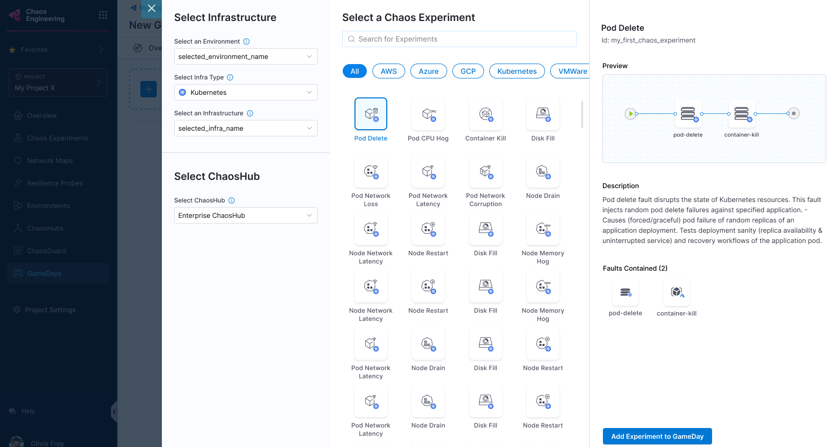 3. Select an environment, an infrastructure type, an infrastructure, and a ChaosHub. Select the chaos experiment and select Add Experiment to GameDay.