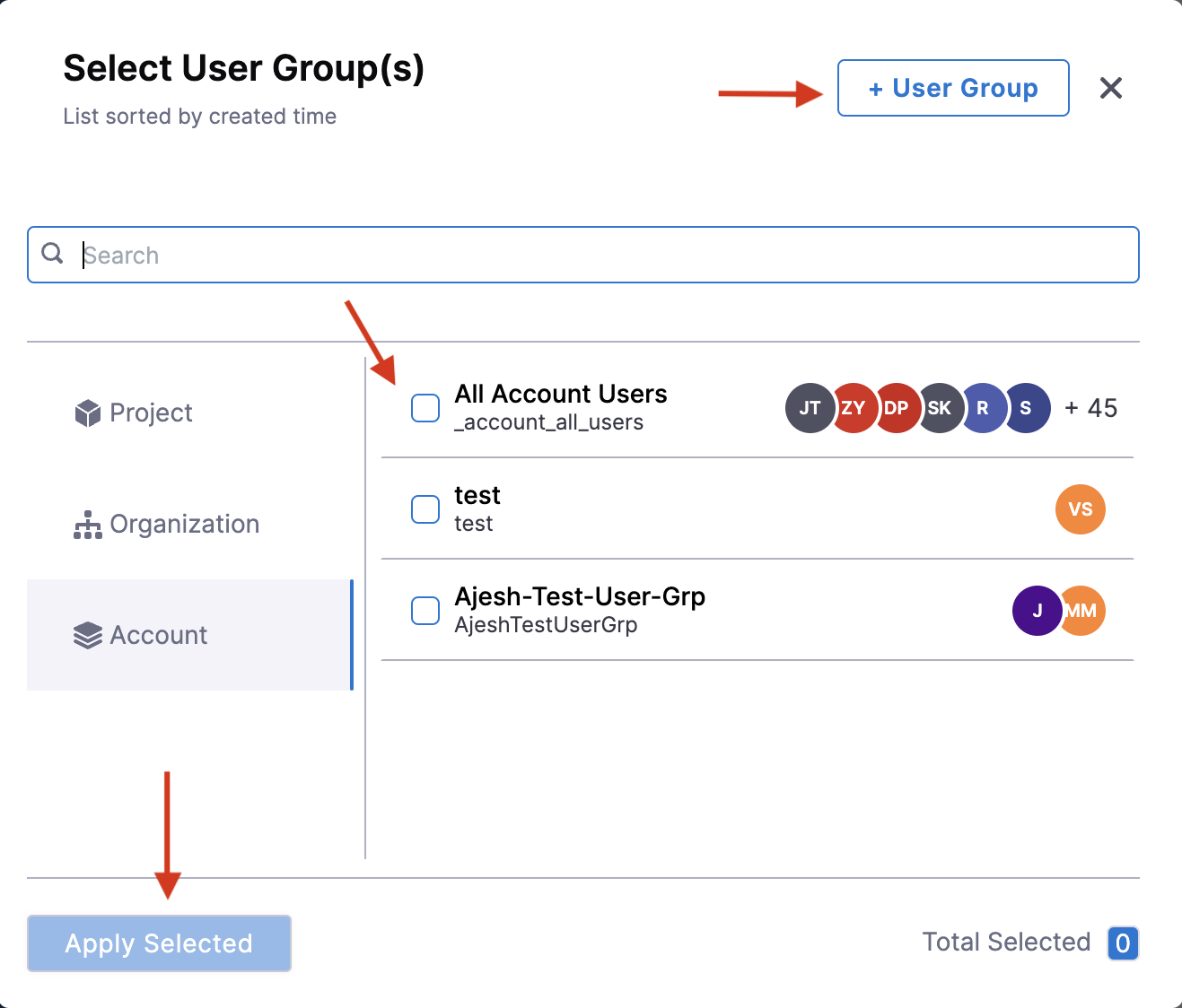 Select user groups. Click Apply Selected.