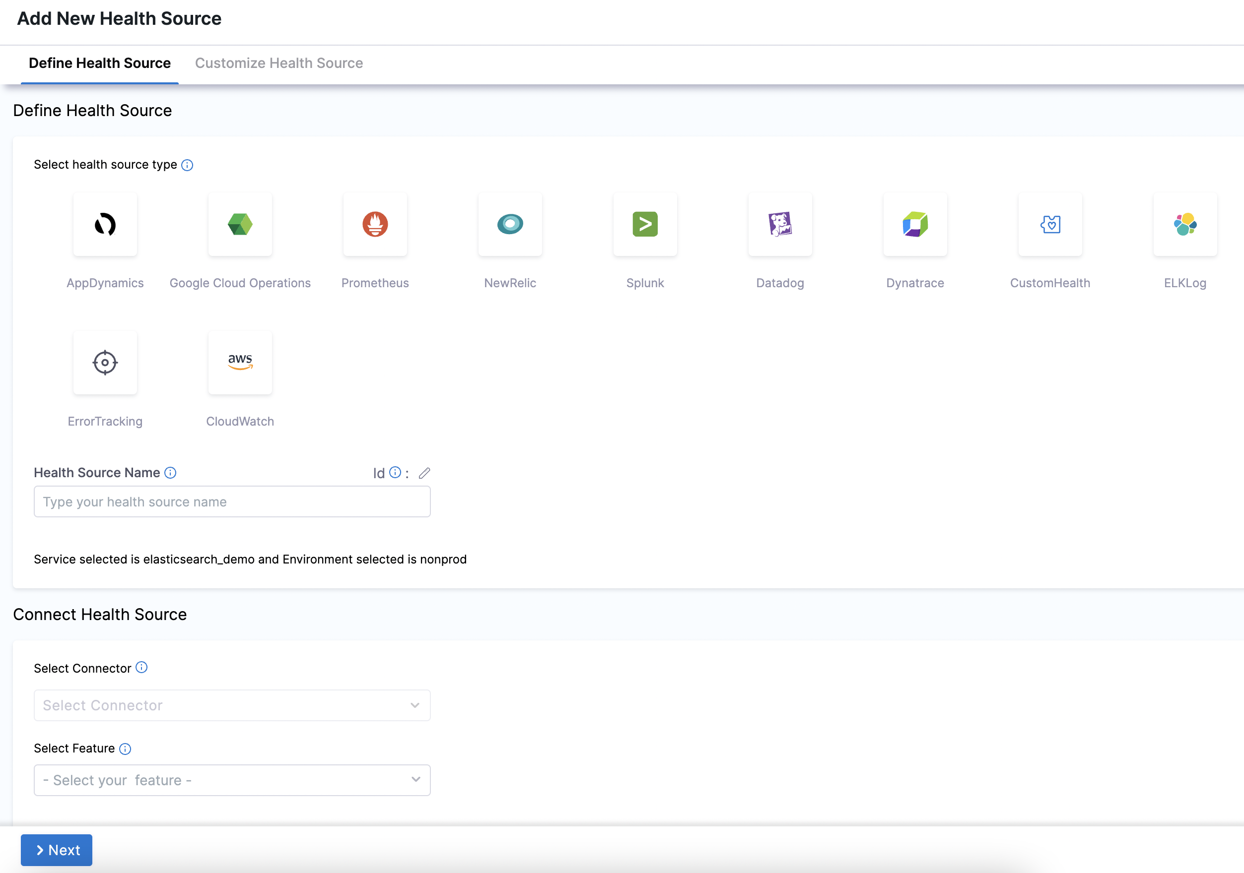 Go to the Service tab, and under Define Your Sources, select + Add New Health Source.