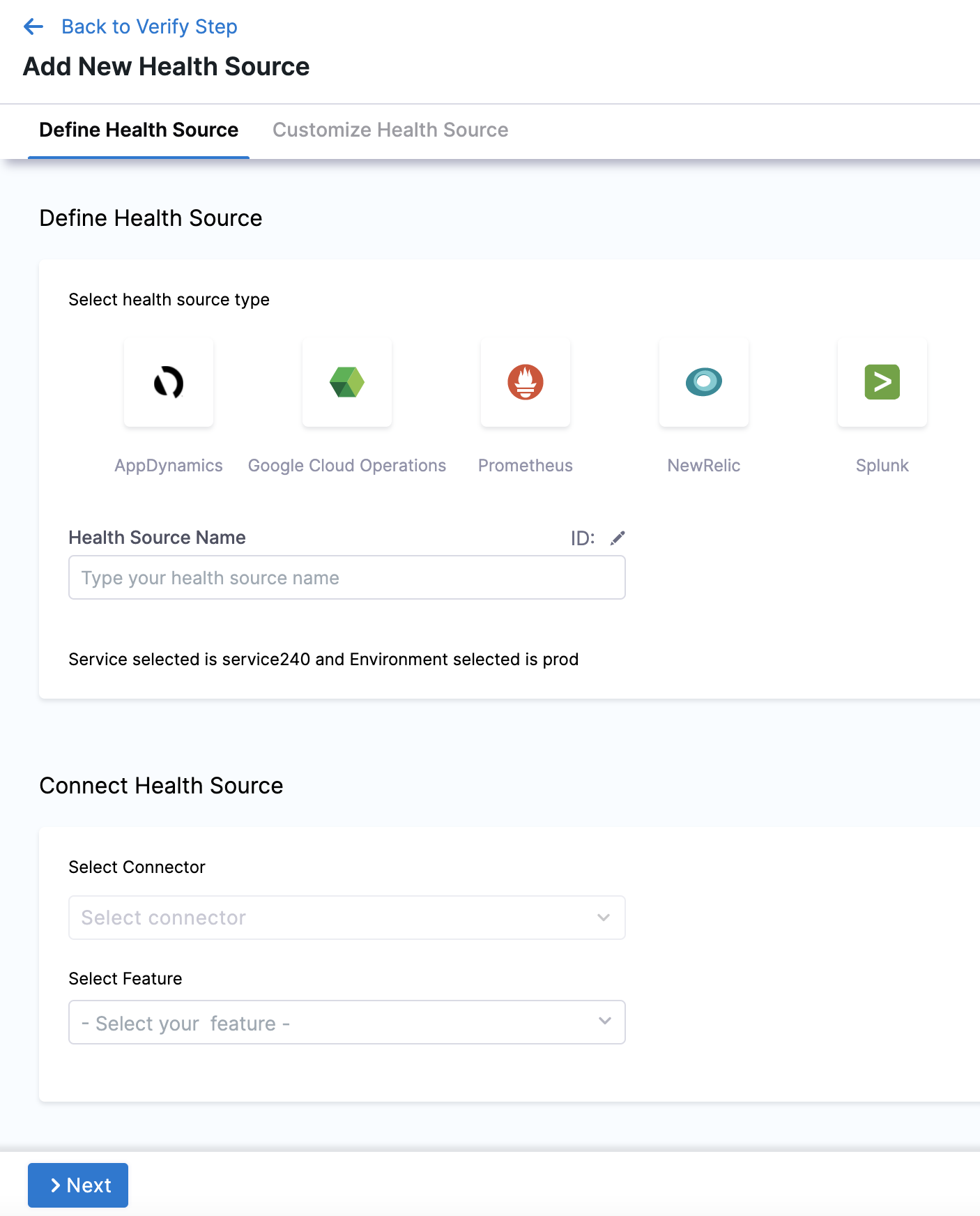 Click Next. The Customize Health Source settings appear. The subsequent settings in Customize Health Source depend on the Health Source Type you selected. You can customize the metrics to map the Harness Service to the monitored environment in Query Specifications and Mapping settings.