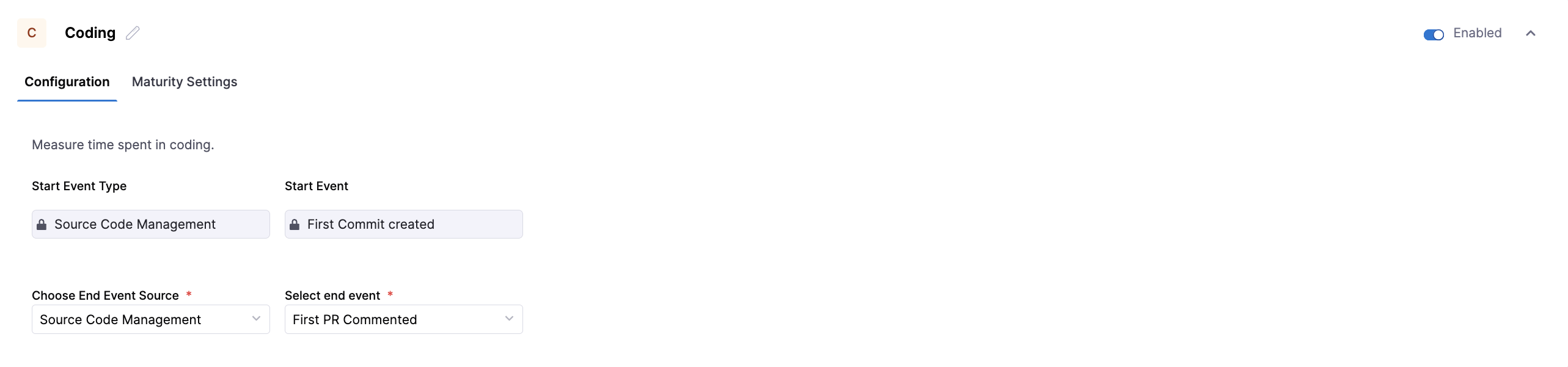 | End Event | The signal that marks completion of the stage. | Last PR Merged Last PR Approval |