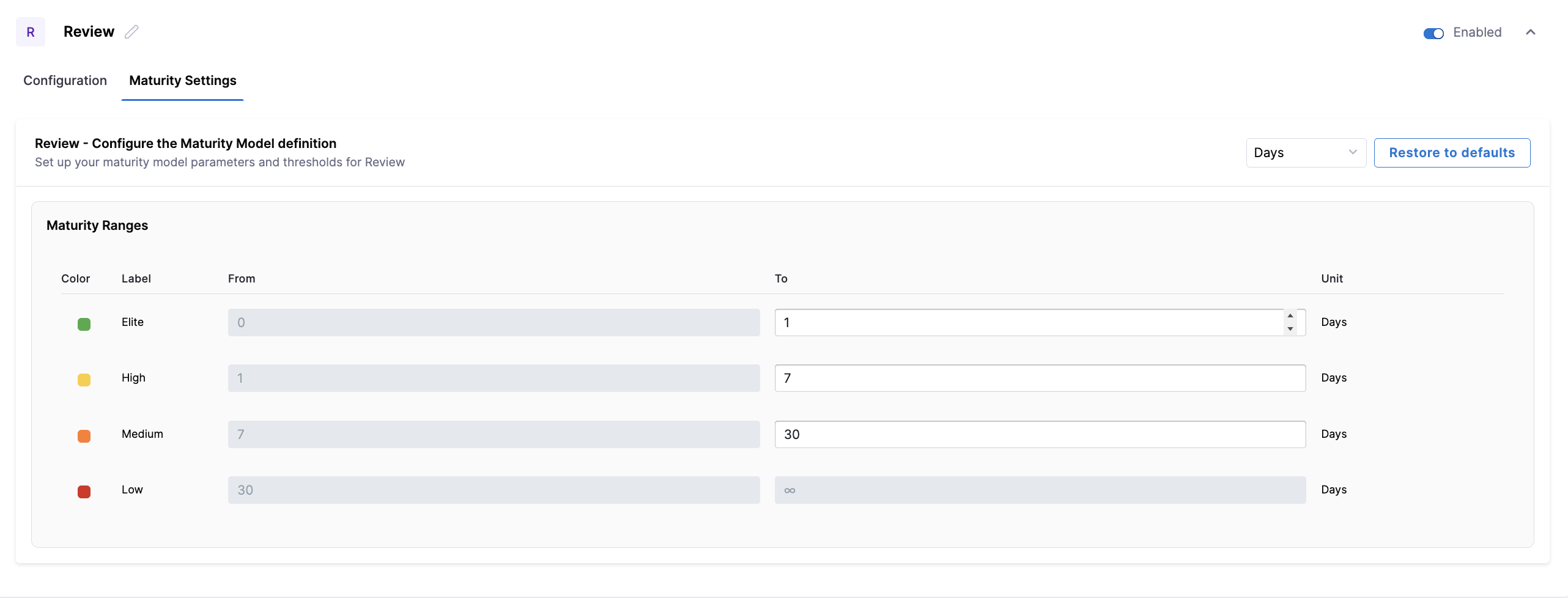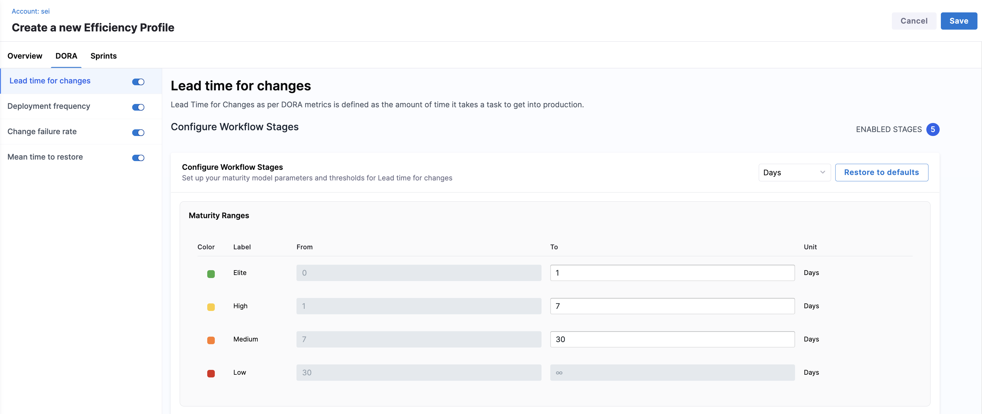 You can define the default maturity model used across all enabled workflow stages in the Configure Workflow Stages section from the Lead time for changes view on the DORA tab. Choose how lead time is measured (in Days, Hours, or Minutes) and click Restore to defaults to reset thresholds to system defaults.