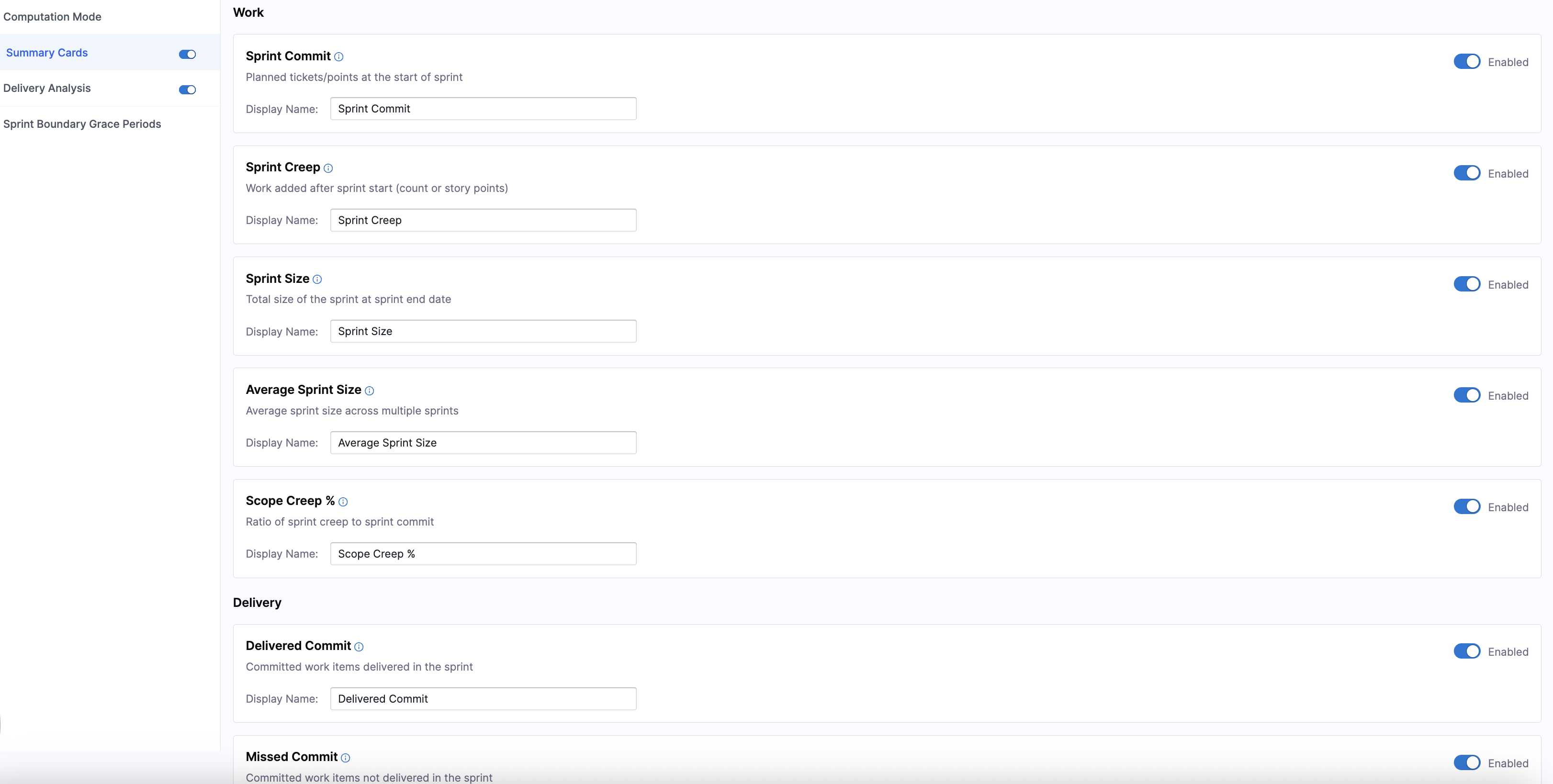 Harness recommends enabling the following metrics to get a strong baseline view of sprint health, delivery efficiency, and predictability: