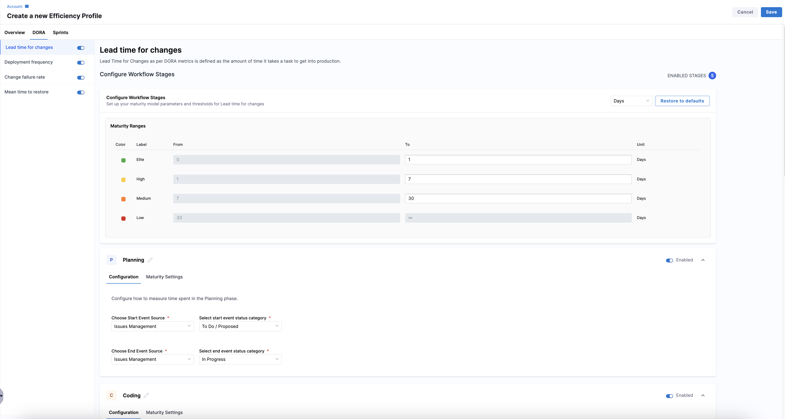 Navigate to the DORA and Sprints tabs to configure the individual metrics for the profile: