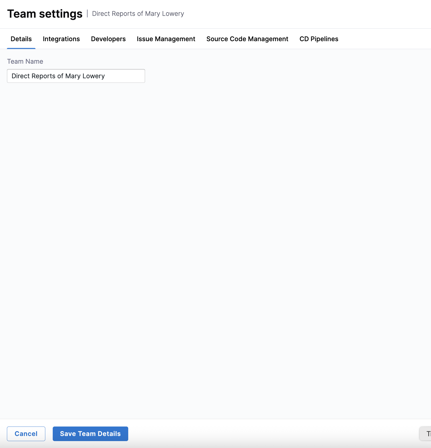 Edit the team name on the Details tab and click Save Team Details.