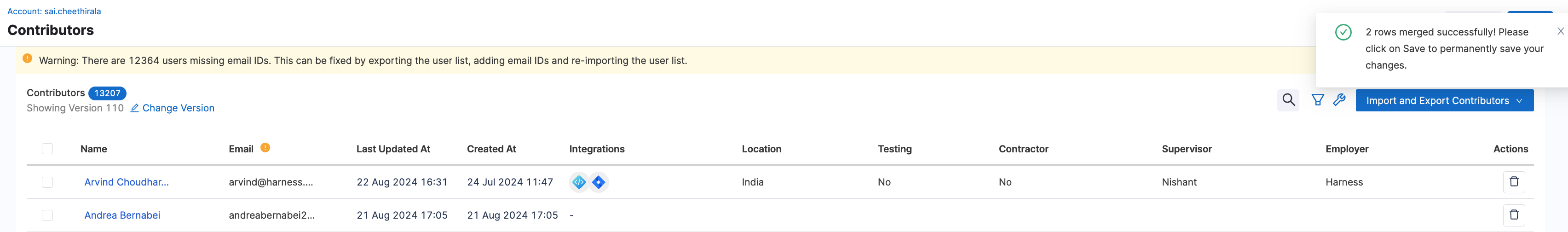 - Identify the duplicate contributor profiles. For example: A contributor with the Harness Code integration and an associated email and the same contributor with the Jira integration but without an associated email.
