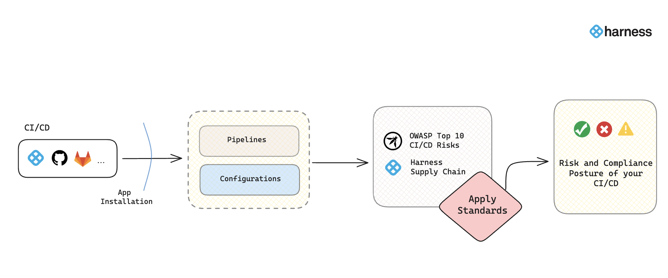 Understanding the risk posture of your CI/CD pipelines is essential for maintaining a secure software delivery process and protecting the overall supply chain. Harness SCS's CI/CD SPM offers a comprehensive view of the potential risks associated with your pipelines. It identifies risk and compliance issues stemming from pipeline configurations, using industry-standard benchmarks like the OWASP Top 10 CI/CD Security Risks and Harness Supply Chain standards.