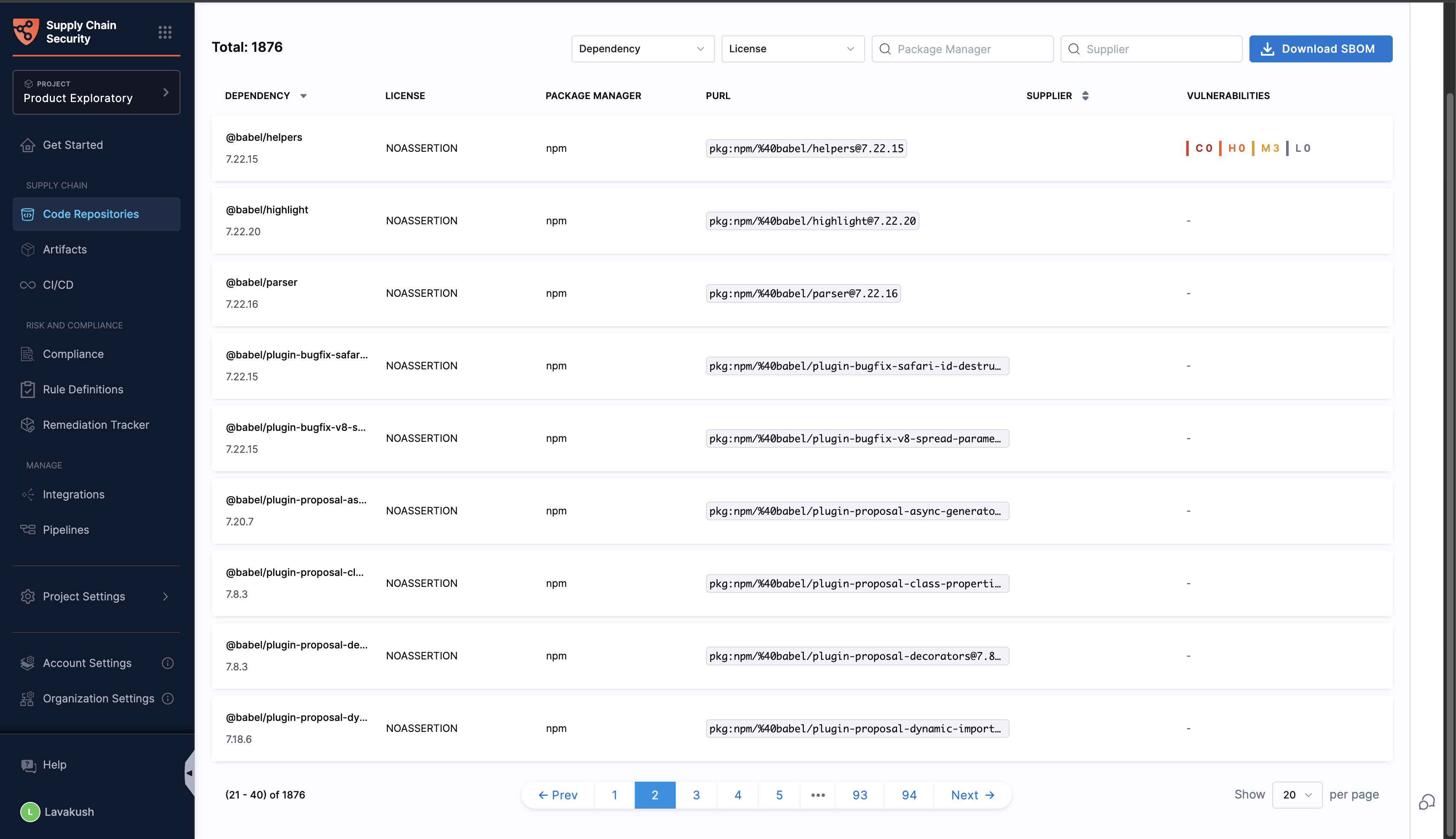 - Use the Download SBOM button available on the Code Repositories page.